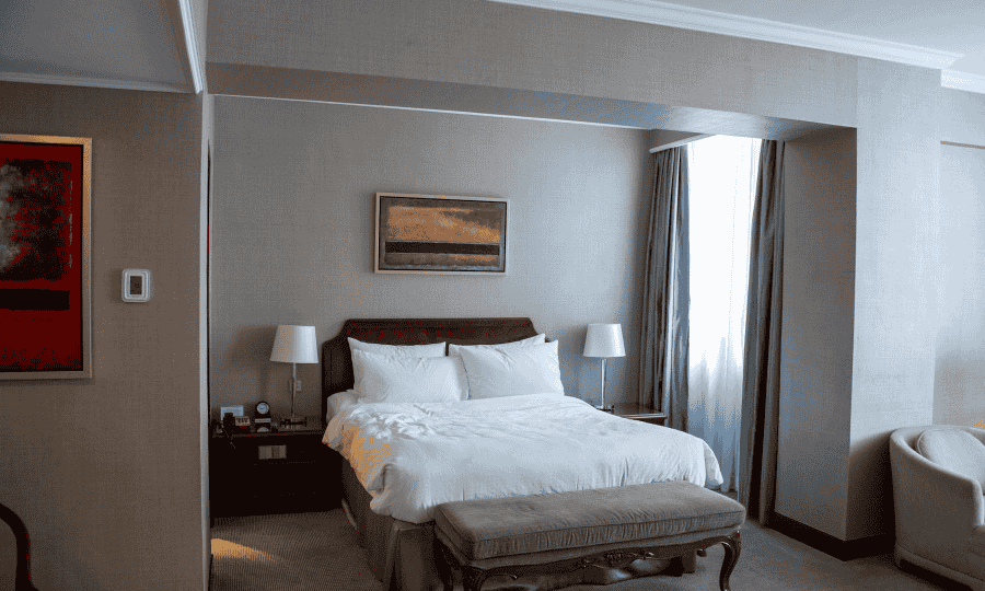 The centerpiece of the Luxe Loft is its king-size bed, dressed in high-quality linens, ensuring a restful night’s sleep. Adjacent to the bed is a comfortable sitting area with plush seating, providing a perfect space to relax or enjoy the stunning views through large windows. The room’s design incorporates elements of industrial chic with exposed brick walls and stylish lighting, creating an atmosphere that is both contemporary and inviting.